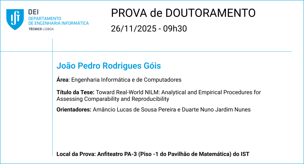 Provas de Doutoramento Prova de Doutoramento do aluno Diogo Afonso Pedro Nunes Terça-feira, 11 de novembro de 2025 09:00 https://tecnico-pt.zoom.us/j/94027043900